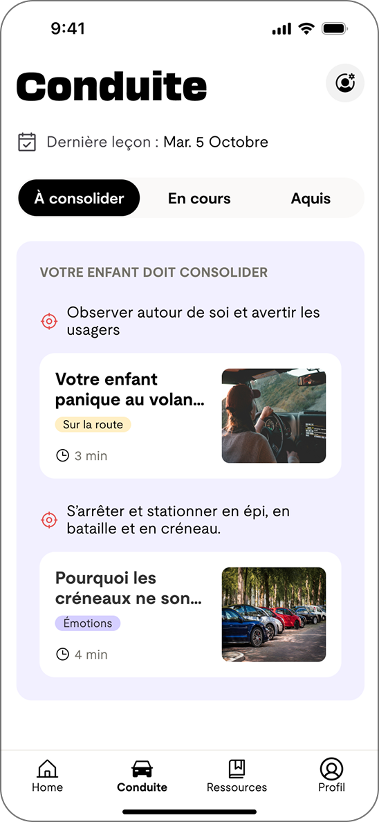 Création une bibliothèque de ressources d'articles et de vidéos avec des conseils sur les méthodes techniques de la conduite & sur l'accompagnement émotionnel à avoir auprès de son enfant