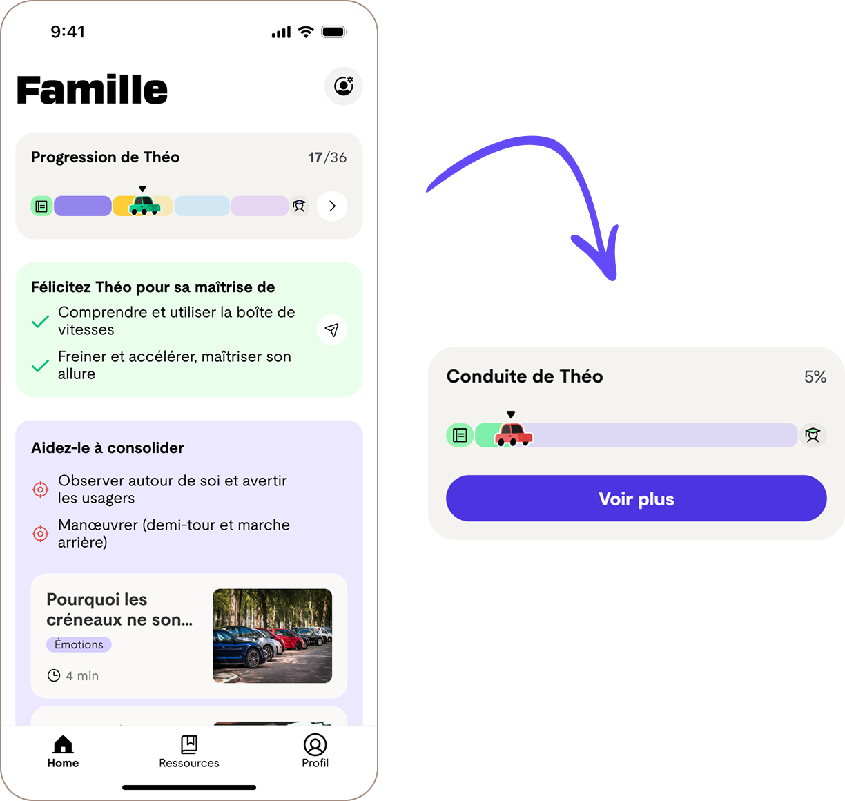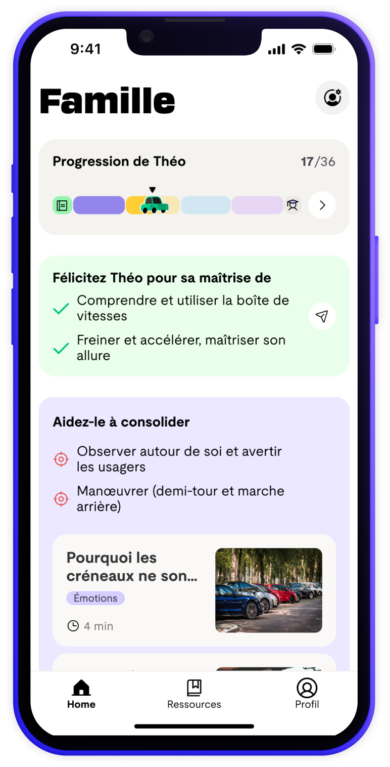 Affichage plus clair de la progression de l’enfant : de l’obtention du code jusqu’au passage du permis